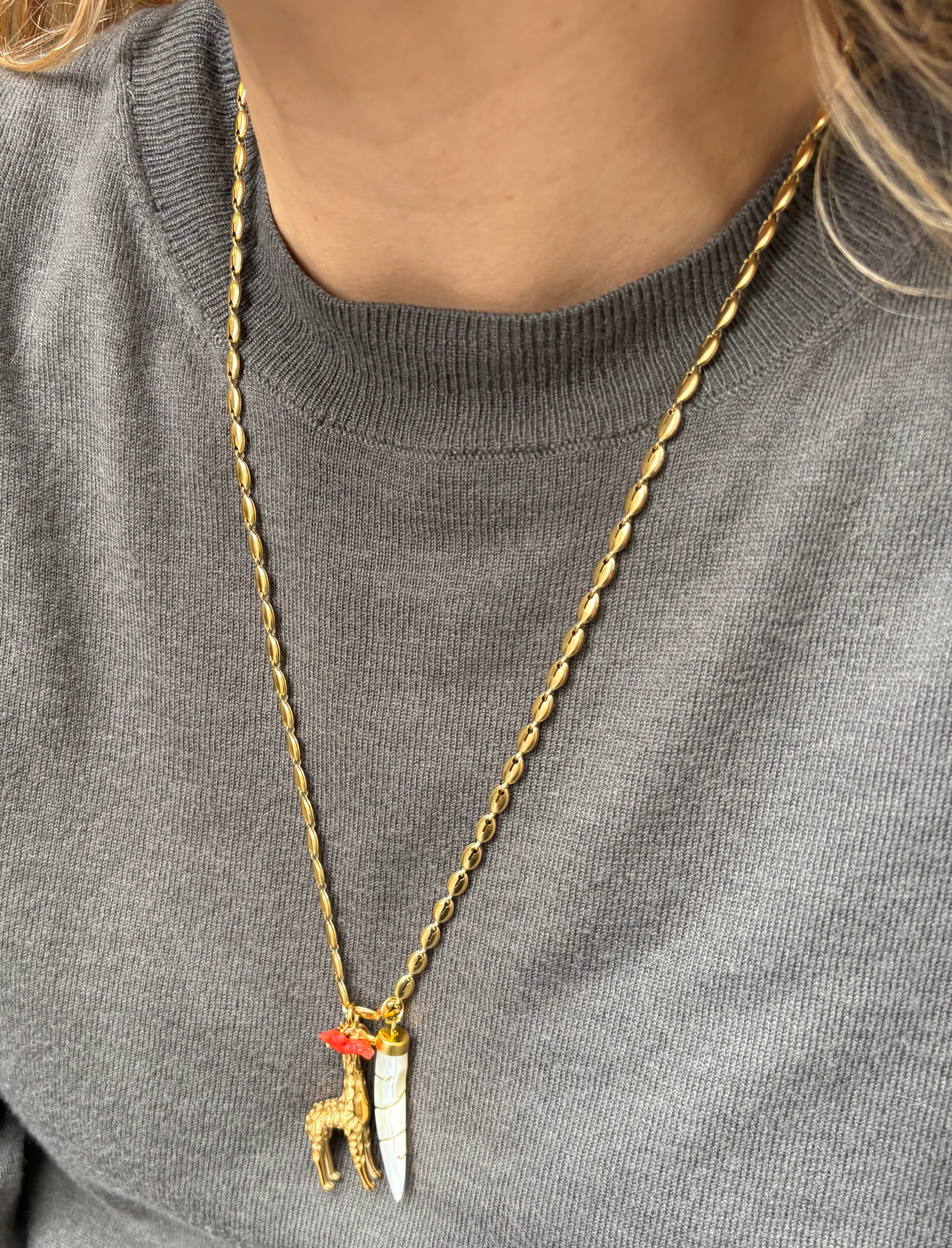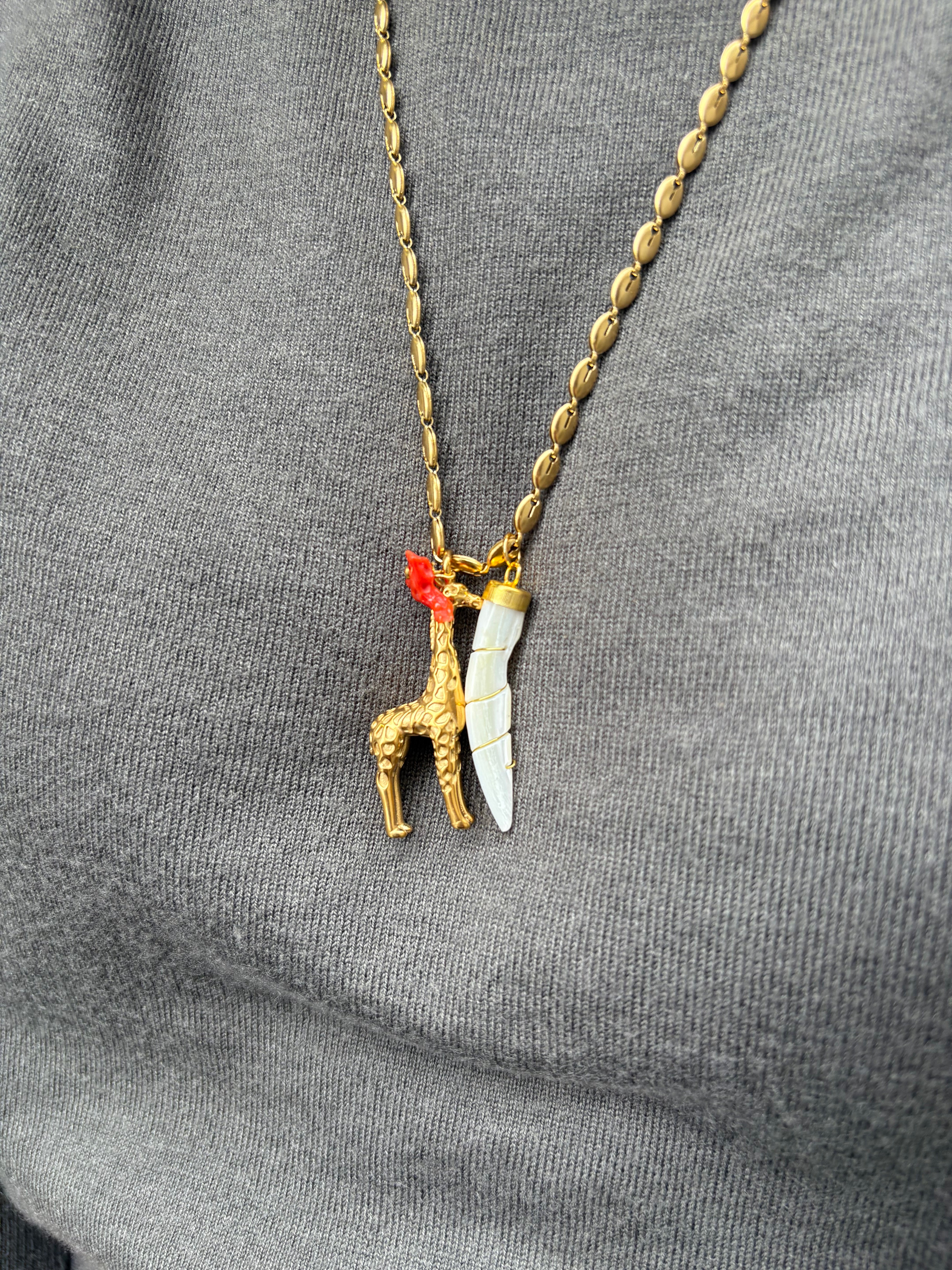 Collar hecho a mano en nuestro taller con charm de jirafa, colmillo de nácar y coral natural.