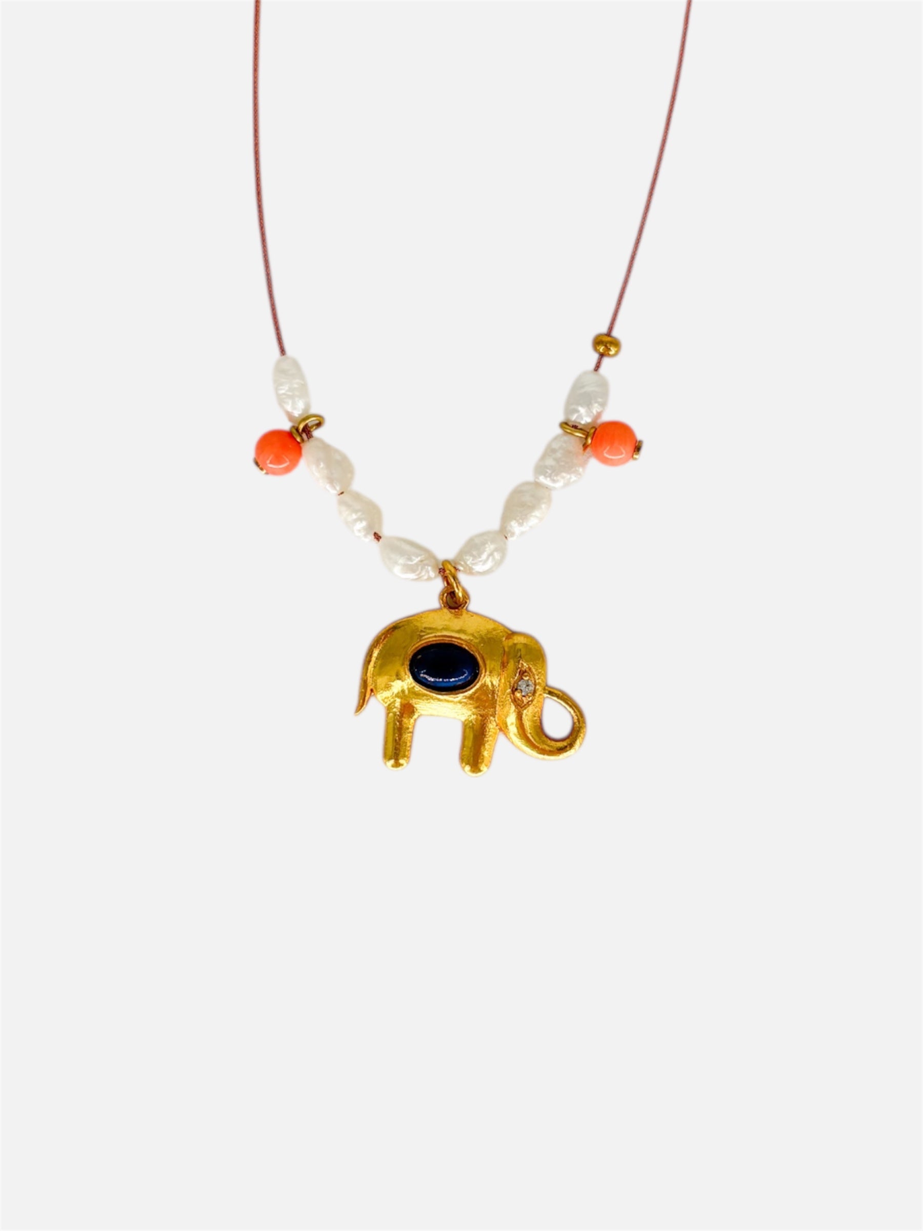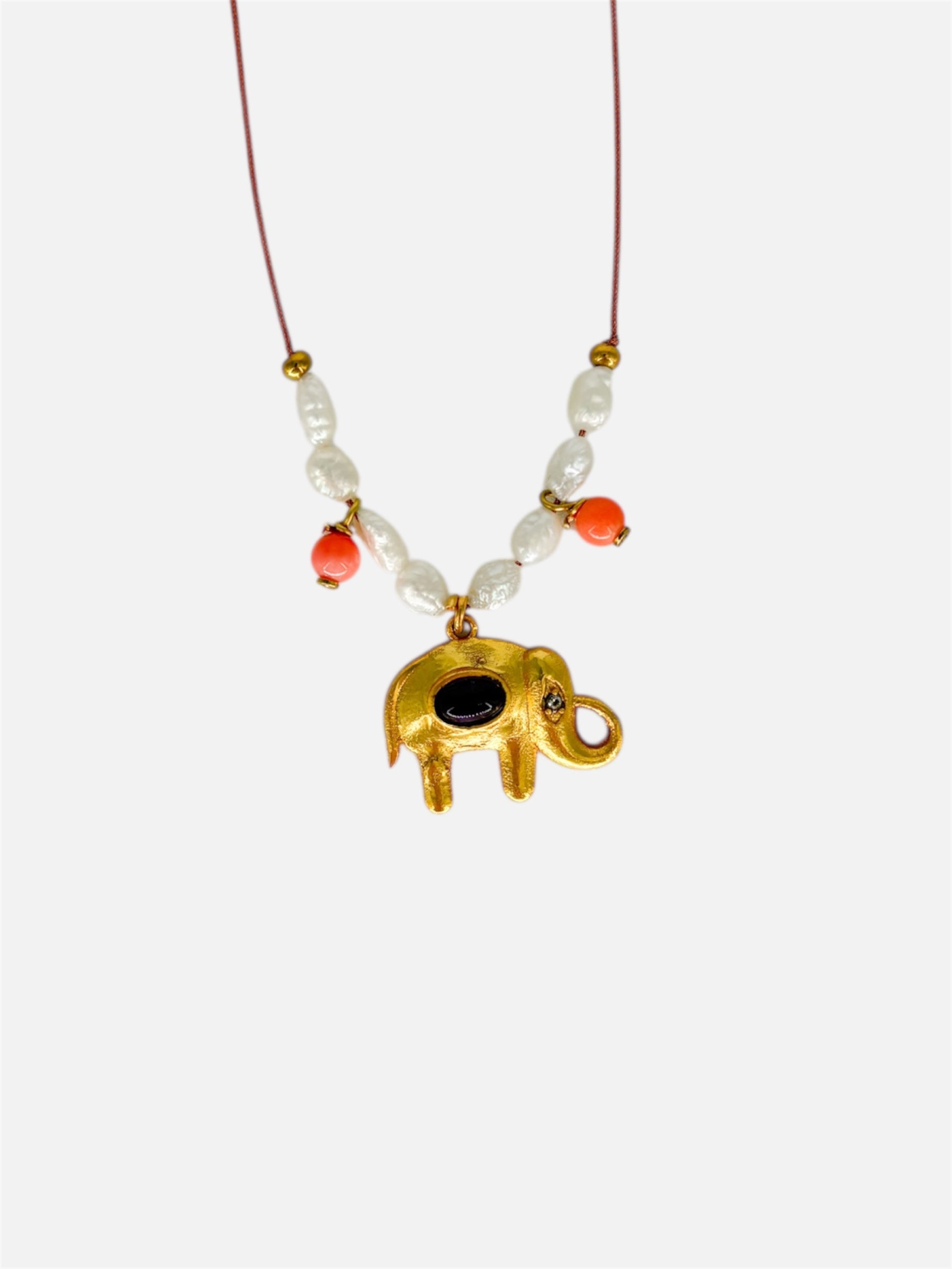 Gargantilla hecha a mano en nuestro taller con elefante de acero y piedra natural, perlas naturales.